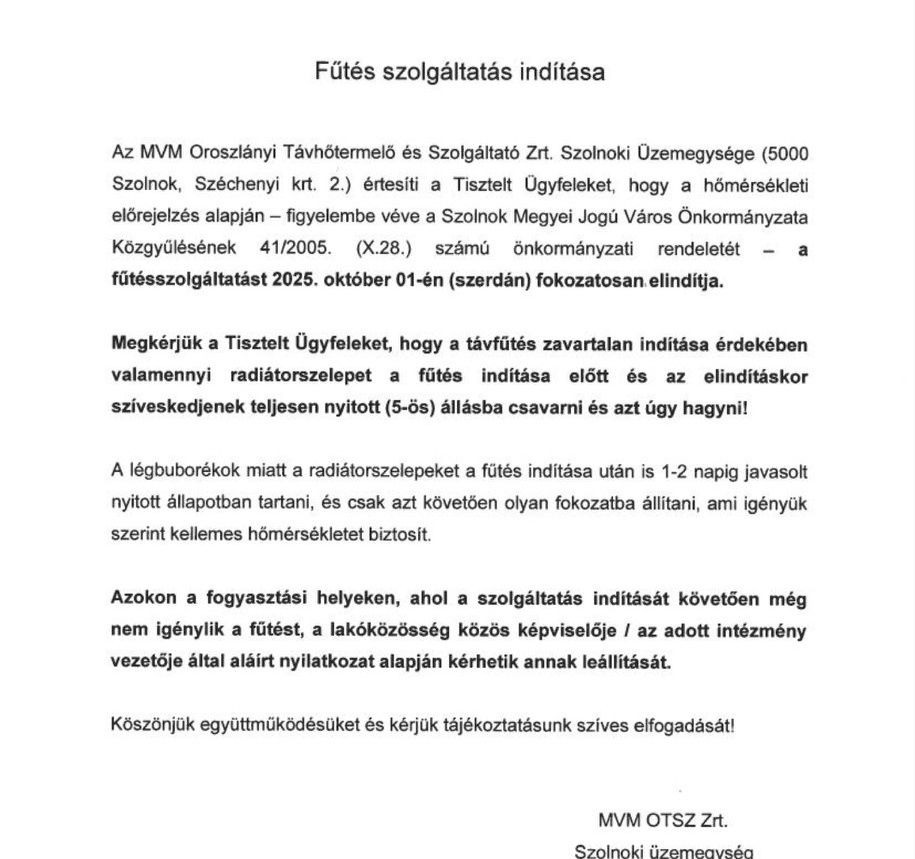 A fogyasztókat arra kérik, hogy a zavartalan megindítás érdekében nyissanak ki valamennyi radiátorszelepet és hagyják is úgy 1-2 napig.